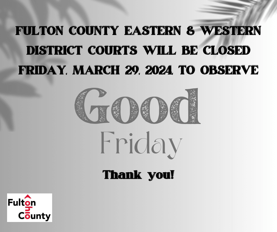 Fulton County Eastern District and Western District Courts will be Closed on Friday, March 29, 2024 in Observance of Good Friday. Thank you!